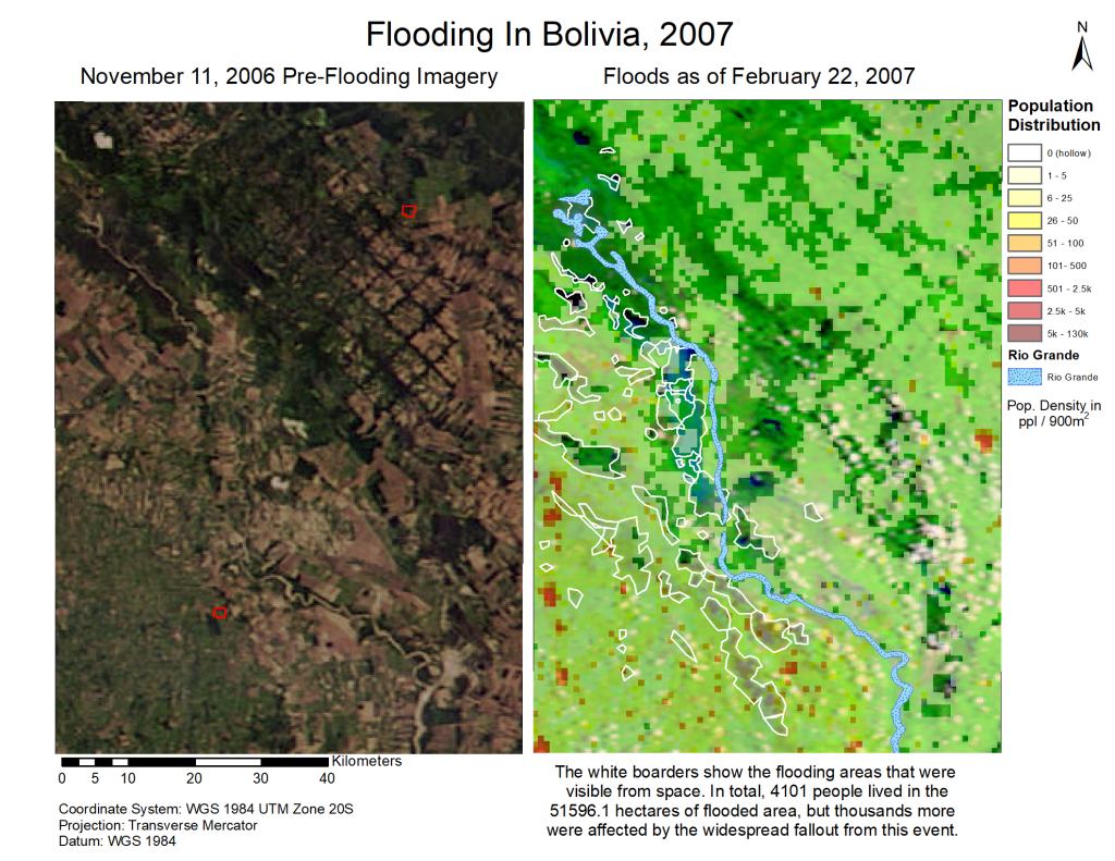 In 2007 and into 2008, heavy rains caused immense flooding throughout Bolivia. Below is a snapshot of a flooded part of the Rio Grande, which pinpoints how many people lived in in the direct path of the floods.