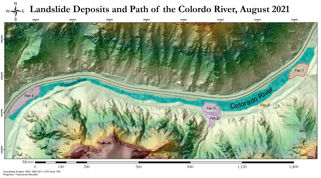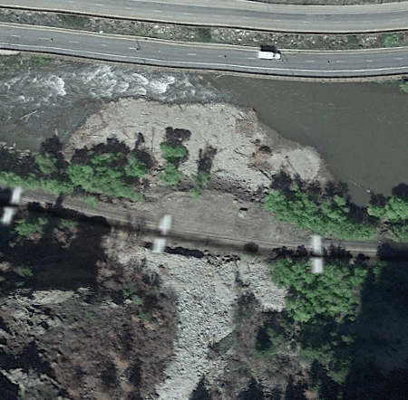 The above maps show a section of the Colorado river where mudslide debris drastically altered the shape of the river. The Colorado is a fast and narrow river, so the debris fans have been eroded away somewhat since their creation, but the riverbed still shows permanent change. Consider the below photos, pulled from Google Earth:
