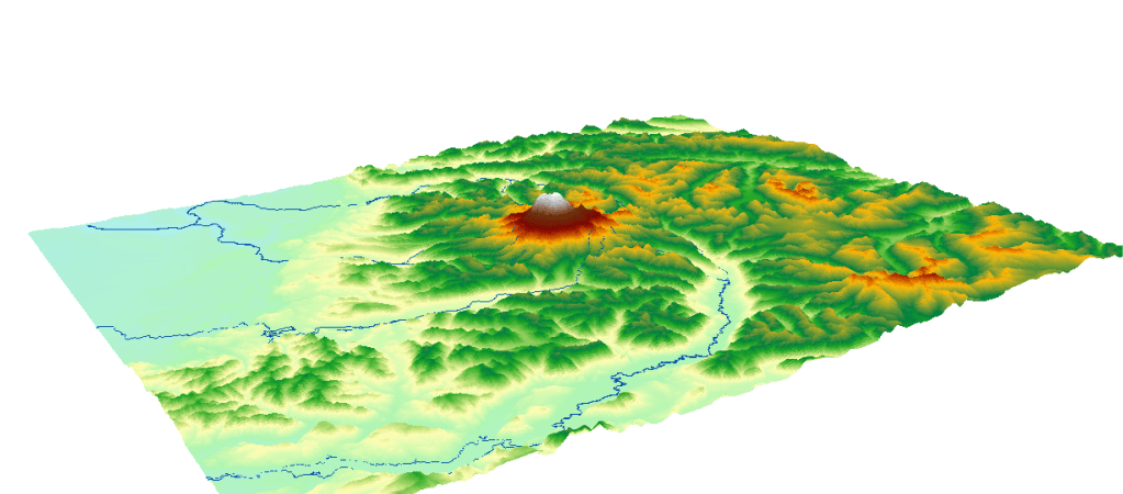 The area surrounding Mt. Rainer, including local rivers (shown in blue).