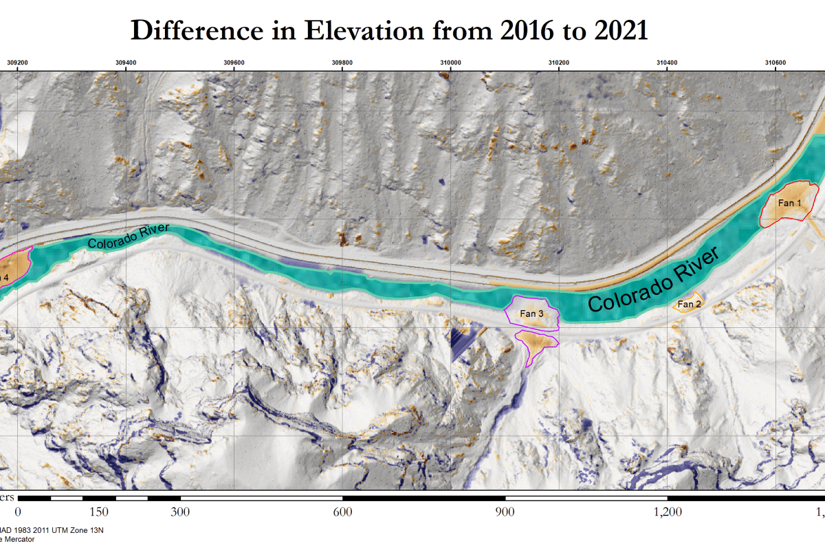 The debris fans caused measurable elevation change, as shown on the map below: