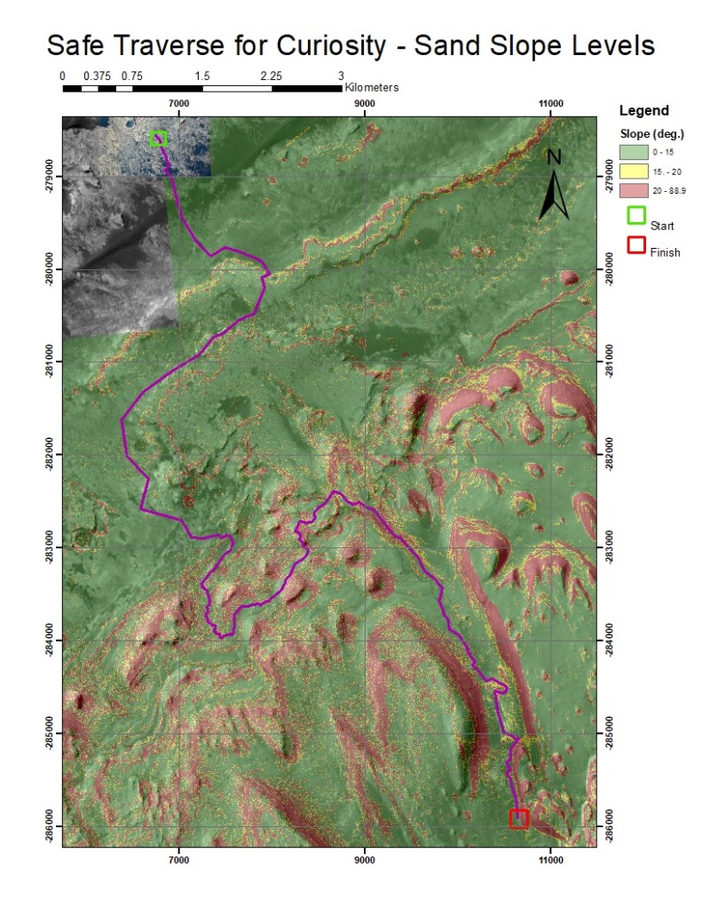 To ensure mistakes in surface material identification don’t result in an accident, the sand map should be used for path definition for the rover.