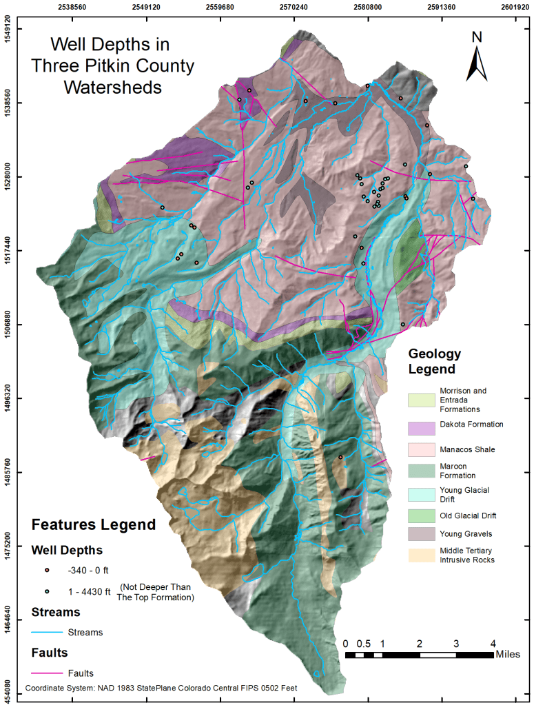There are a lot of wells in Pitkin County, and they are sorted by watershed. This analysis determined the depths of all the wells in relation to the Alluvial aquifer (the top formation) and found which wells are assigned to the wrong watersheds.