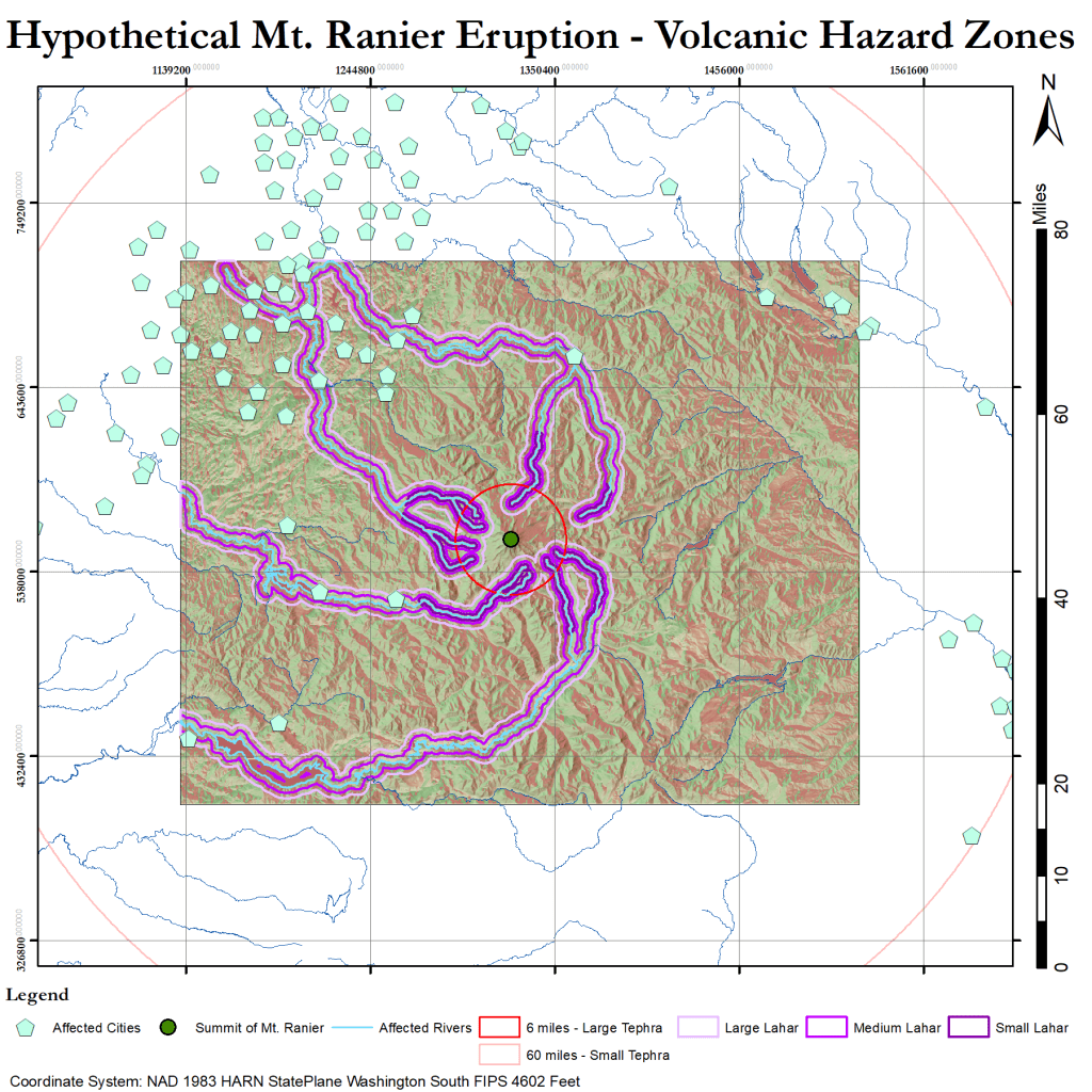 Mt. Ranier is a formidable volcano, and there is a lot of civilization near her. This map tracks where lahars are most likely to flow, as well as where large and small tephra would fall. There are dozens of cities right inside the small tephra zone, and 10 in direct danger of being hit by a lahar. The small lahar flows are 1 km in width, the medium 2 km, and the large 4 km. Large tephra are large enough to cause death upon impact, and may still be hot enough to start fires. Small tephra are other particulates that can fall with enough density to accumulate. the 60 mile range is where 10cm of small tephra accumulation is still considered possible. The red and green coloring on the area of interest indicate the slope of the ground.