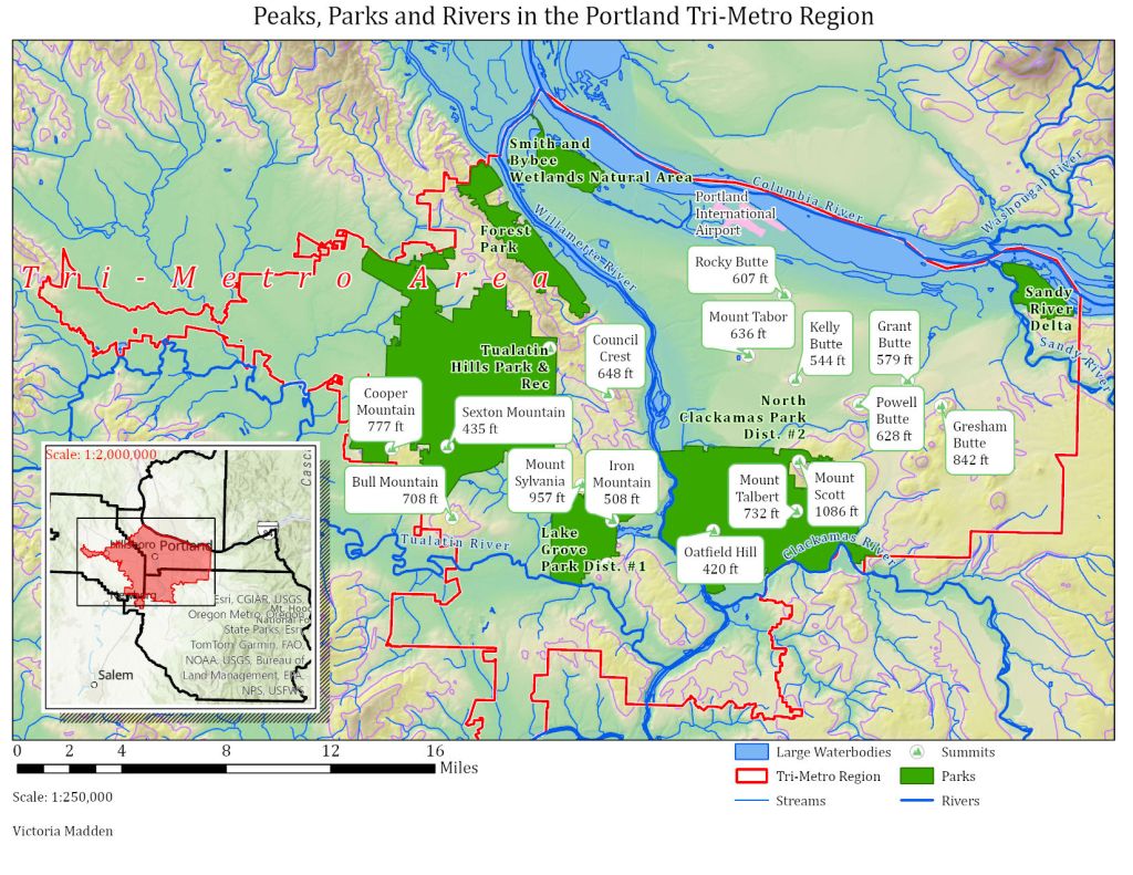 This map was an exercise in extracting, cleaning, and communicating the wealth of information found in geographic data files, including park boundaries and names, summit locations, elevations, and names, and river paths. It was important to display all these different things clearly and without obscuring any names or other information.