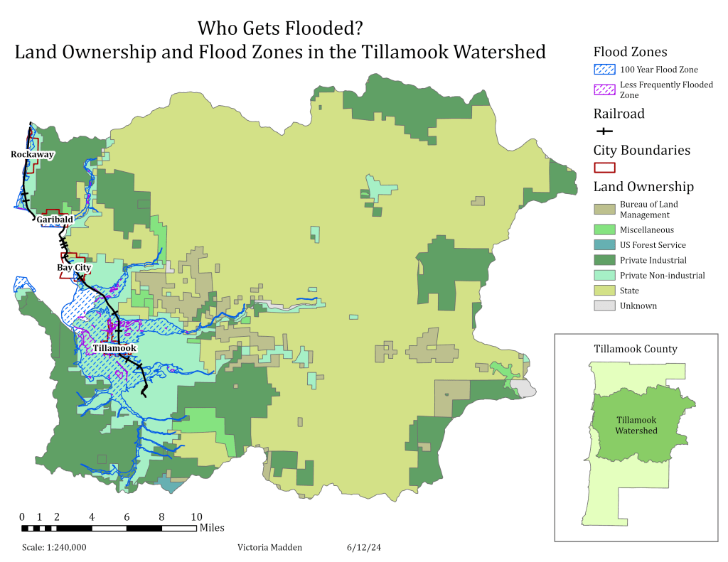 This map aims to show who owns land in the most flood-prone areas of the Tillamook Watershed. It is clear from the map that most flooding happens on privately owned land that is not used for industrial purposes, something that makes sense when thinking about who is likely to own land near rivers and water. This map can be used to help people understand the risks of buying land in certain areas so they can best plan for disaster.