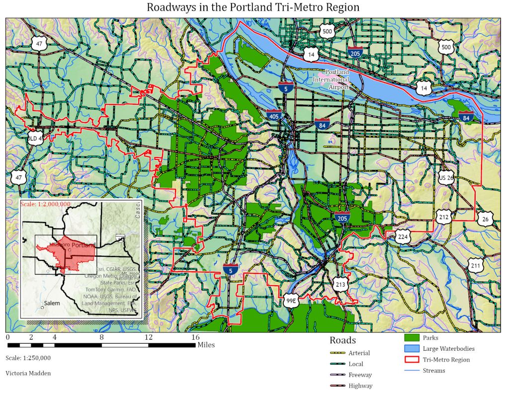 This map shows the various major roadways through the area of interest with each type, as classified in the source data, marked and labeled.